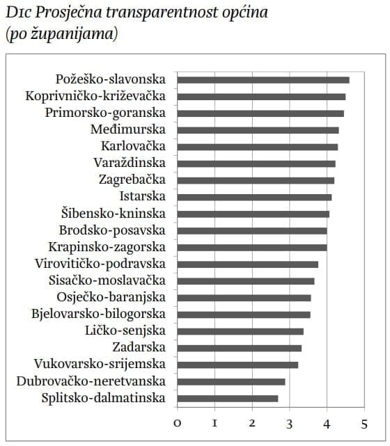 Gledano po županijama, općine su najtransparentnije u Požeško-slavonskoj (4,6) te Koprivničko-križevačkoj i Primorsko-goranskoj (obje 4,5), a najnetransparentnije u Splitsko-dalmatinskoj (2,7) i Dubrovačko-neretvanskoj (2,9).