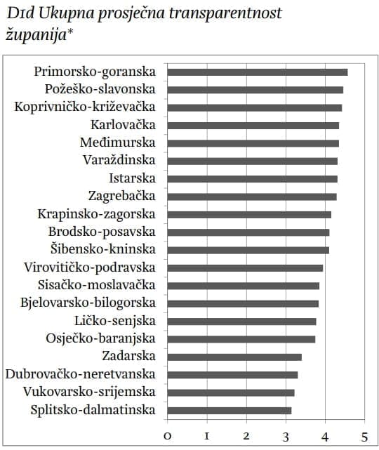 Po ukupnoj prosječnoj transparentnosti proračuna svih jedinica na području županije najtransparentnije su Primorsko-goranska (4,6), Požeško-slavonska (4,5) i Koprivničko-križevačka (4,4), a najnetransparentnije Splitsko-dalmatinska (3,1), Vukovarsko-srijemska (3,2), Dubrovačko-neretvanska (3,3) i Zadarska (3,4) županija.