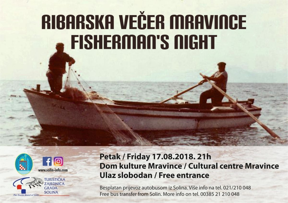 U organizaciji TZ grada Solina u suradnji MO Mravince ovaj petak 17.08.2018. s početkom u 21:00h ispred Doma kulture u Mravincima održati će se Ribarska večer. Uz ribu s gradela i crni rižot, posjetitelji će uživati u nastupu benda „Galaxy“. Osiguran je i besplatan prijevoz autobusom iz Solina u 20:40h (parking Glorijet) do Mravinaca te povratak u 23:00h.