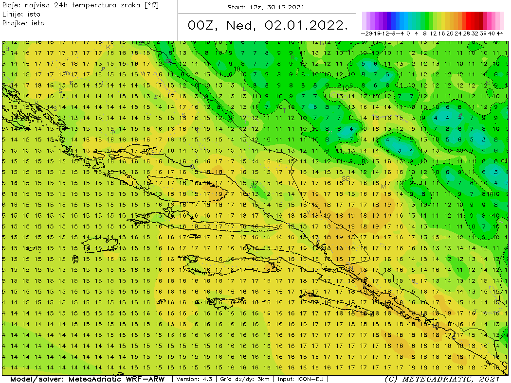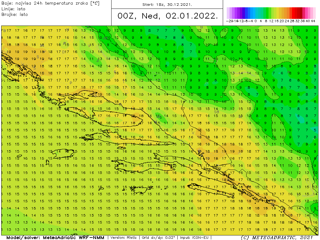 Prema prognostičkim materijalima, petak i subota bit će još malo topliji pa će najviše dnevne temperature zraka u nekim dijelovima Dalmacije vjerojatno dosezati 20°C. Zbog toga postoji mogućnost da se ponegdje izmjeri najviša prosinačka temperatura zraka u povijesti mjerenja na nekim lokacijama.