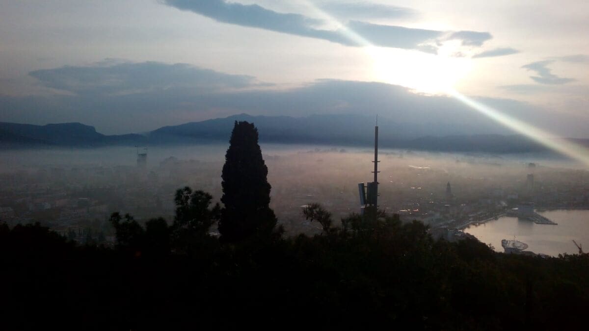 Tanki oblačni sloj i magla prekrili su Split ispod razine Marjana, tako da se s omiljenog splitskog brda rano jutros mogao vidjeti prekrasna prizor. Iz tankog oblačnog sloja virili su samo najviši dijelovi Splita, poput sjevernog nebodera Westgatea u izgradnji.