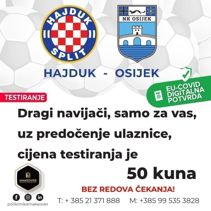 Poliklinika MakeOver cijelu godinu vjerno bodri i navija zajedno s našim navijačima. Povodom utakmice s Osijekom u nedjelju, uz predočenje karte ili pretplate, u poliklinici MakeOver testiranje će biti po 50 kuna i to na dvije lokacije – Antuna Branka Šimića 33 na Blatinama i na rivi, Obala hrvatskog narodnog preporoda 21 (Agencija Grey Line).