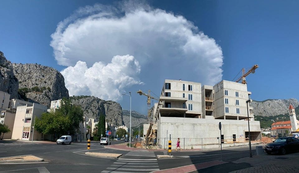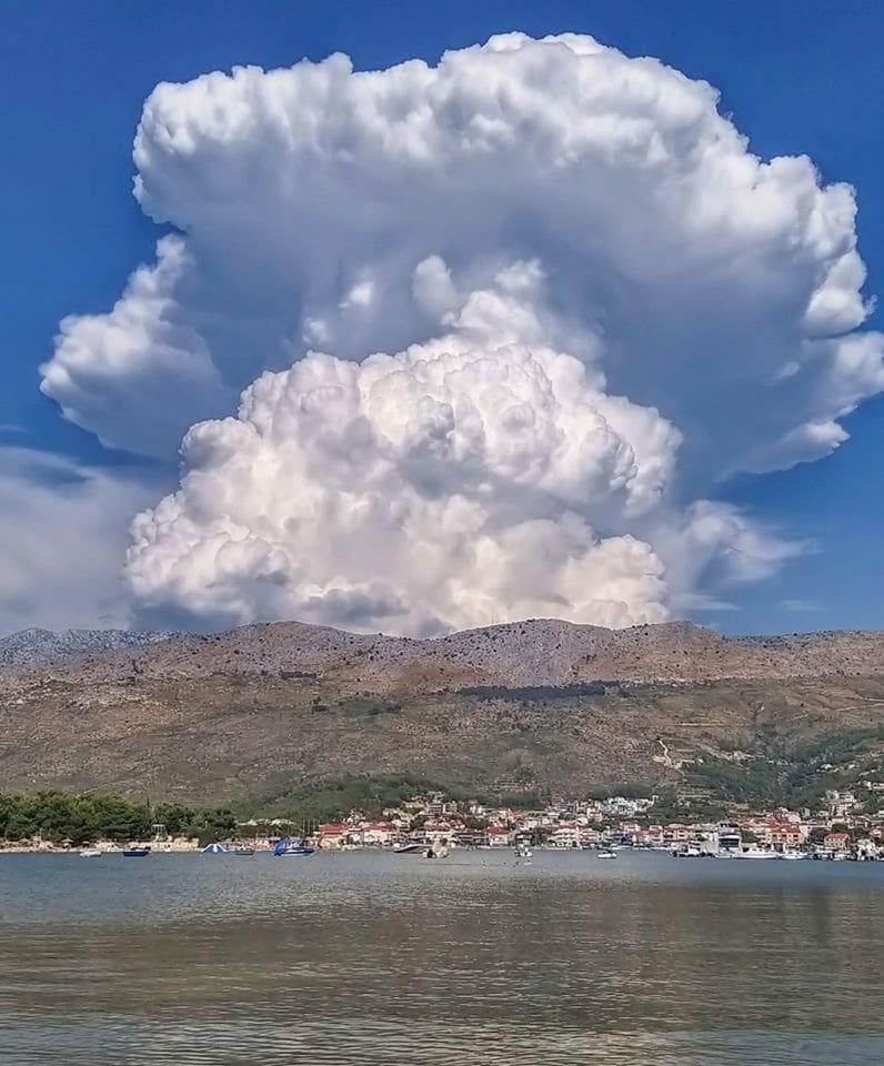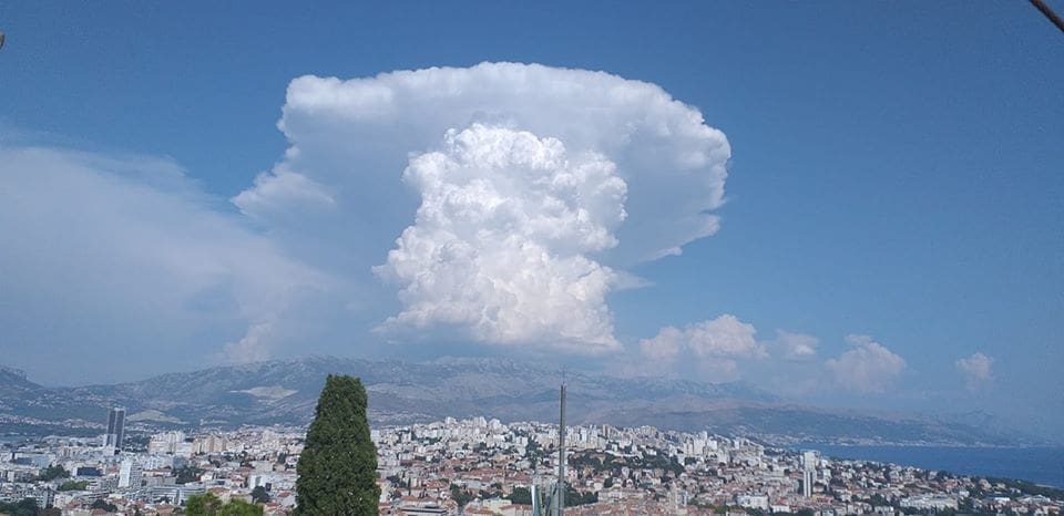 Ponedjeljak u većem djelu Dalmacije protječe u znaku stabilnog i suhog vremena. U poslijepodnevnim satima je došlo do većeg razvoja oblaka u Dalmatinskoj zagori. Olujni kumulonimbusi razvili su se iznad pograničnog dijela Dalmacije i Bosne i Hercegovine, a prizor s obale je bio spektakularan.
