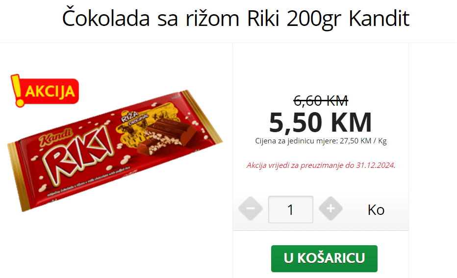 Cijena Rikija je niska i u Konzumu u BiH, doduše za 200 grama čokolade, kao i u ostalim tamošnjim dućanima.