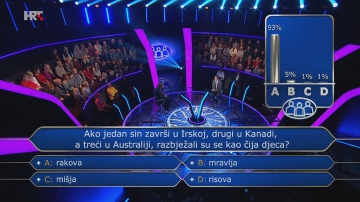 Ako jedan sin završi u Irskoj, drugi u Kanadi, a treći u Australiji, razbježali su se kao rakova, mravlja, mišja ili pak risova djeca? Kako bi saznao odgovor, zamolio je pomoć publike. Publika je 93 posto glasova dala rakovoj djeci te natjecatelju osigurala otvaranje pitanja za 2.000 kuna.