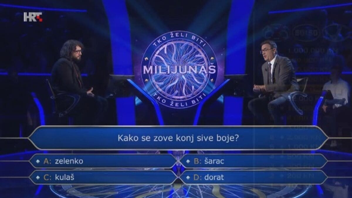 Nakon što je prešao prvi prag, urednik u maloj izdavačkoj kući pomoć džokera nije trebao sve do 12. pitanja za spomenutih 125.000 kuna u kojemu se tražilo ime konja sive boje. Kako bi suzio izbor ponuđenih odgovora iskoristio je džoker "pola-pola". Ostali su tako zelenko i šarac, a ispali odgovori kulaš i dorat.