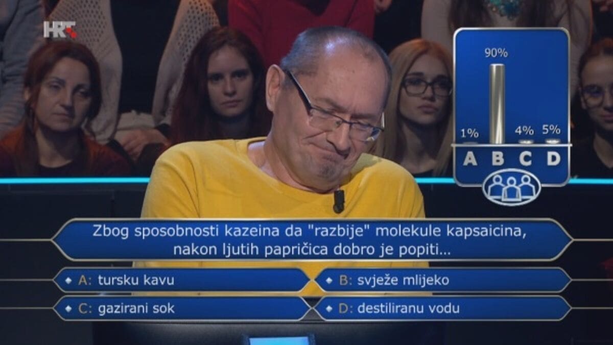 Elektroinženjer iz Zagreba prvoga džokera, također "publiku", zatrebao je na pitanju za 4.000 kuna ne bi li otkrio je li nakon ljutih papričica, zbog sposobnosti kazeina da "razbije" molekule kapsaicina, dobro popiti tursku kavu, svježe mlijeko, gazirani sok ili destiliranu vodu.