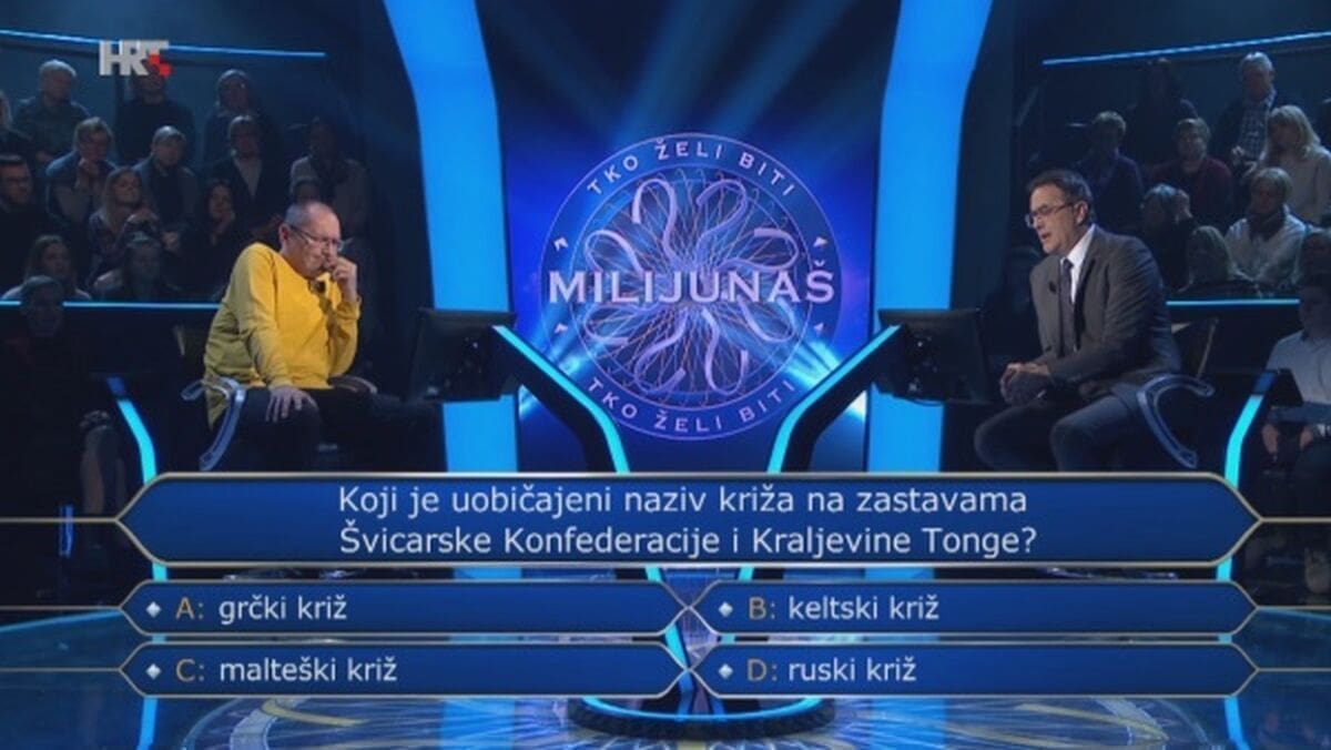 Ipak, posljednji večerašnji natjecatelj kući je ponio 16.000 kuna jer je odustao na pitanju za prelazak drugoga praga. Nije znao koji je uobičajeni naziv križa na zastavama Švicarske Konfederacije i Kraljevine Tonge. Iako je iskoristio i posljednjega džokera, "pola-pola", kojim su od ponuđenih odgovora - grčkog, keltskog, malteškog i ruskog križa ostali onaj grčki i malteški, nije se usudio kockati.