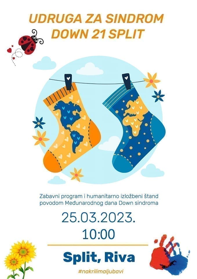Povodom današnjeg, svjetskog dana sindroma Down ove subote, 25. ožujka od 10 sati na Rivi će članovi udruge zajedno sa Splićanima veselit - pjevat, plesat, ali i izložiti humanitarni štand na kojem će moći kupiti razni uskrsni motivi izraženi ručicama članova Udruge.