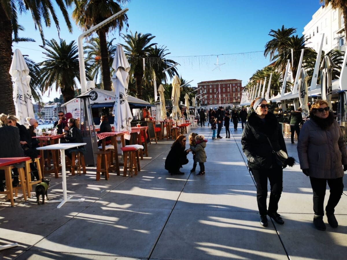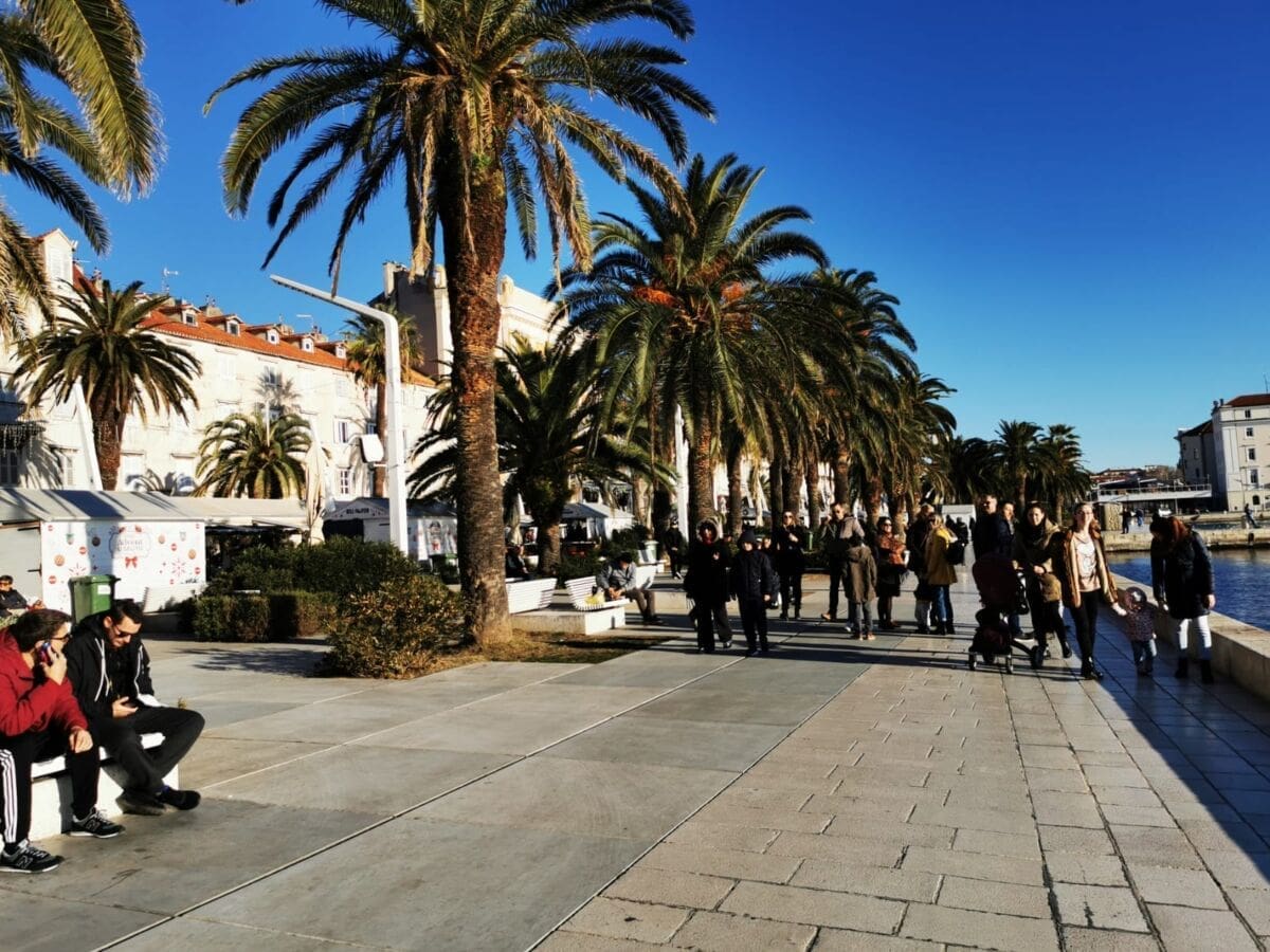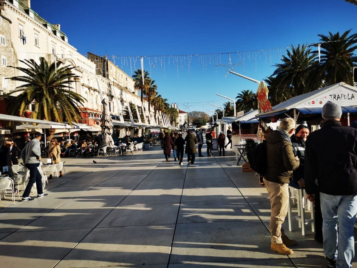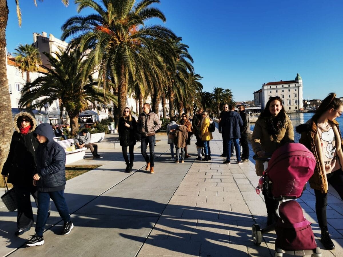 Još jedan neradni, a sunčan, zimski dan izmamio je Splićane na omiljenu šetnicu. Barem one koji nisu iskoristili produženi vikend za bijeg iz grada. Adventske kućice su tradicionalno puste, a većina građana zrake sunca upija na štekatima.