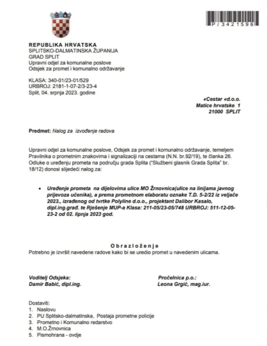 Splitsko-dalmatinska županija, Grad Split, Uprava za komunalne poslove, 4. srpnja 2023. godine izdala je službeni Nalog za izvođenje radova vezanih uz uređenje prometa na dijelovima ulice u Mjesnom odboru Žrnovnica. Radovi se odnose na dijelove ulice kroz koje prolaze linije javnog prijevoza učenika, a u svrhu sigurnijeg i učinkovitijeg prometovanja tim područjem.Nalog je donesen temeljem Pravilnika o prometnim znakovima i signalizaciji na cestama (NN br. 92/19) te članka 26. Odluke o uređenju prometa na području grada Splita ("Službeni glasnik Grada Splita" br. 18/12). Prema prometnom elaboratu oznake T.D. 5-2/22, izrađenom u veljači 2023. godine od strane tvrtke Polyline d.o.o., radovi su projektirani od strane diplomiranog inženjera građevine, Dalibora Kasala. Ovaj projekt također je dobio potrebna odobrenja i suglasnosti nadležnih institucija, uključujući i rješenje MUP-a Republike Hrvatske, Klasa: 211-05/23-05/748, URBROJ: 511-12-05-23-2 od 2. lipnja 2023. godine.