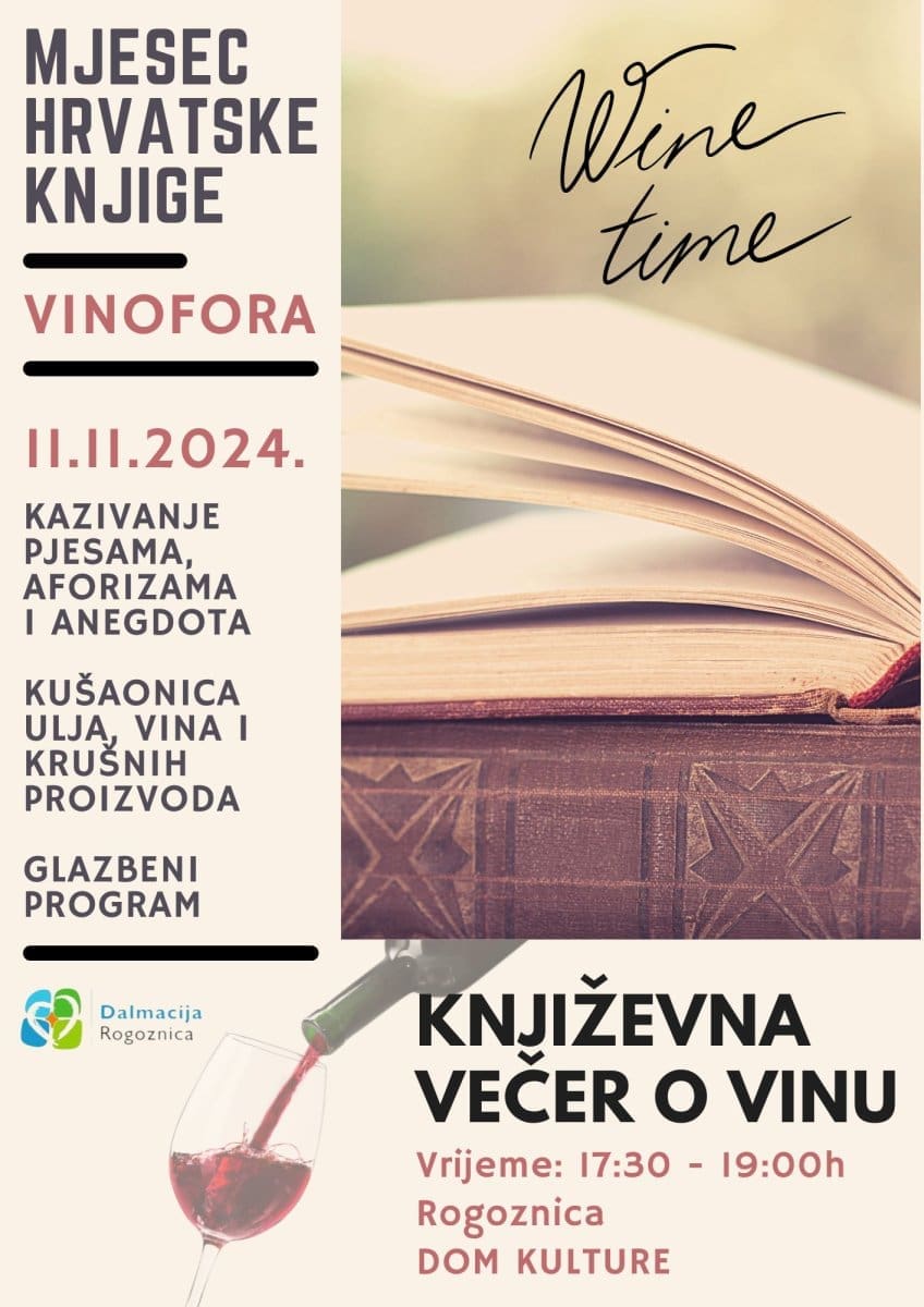 Organizatori pozivaju sve ljubitelje vina, književnosti i dobre glazbe da se pridruže ovoj kulturno-gastronomskoj večeri koja slavi vinsku baštinu Rogoznice i Dalmacije. Manifestacija je idealna prilika za one koji žele uživati u vrhunskim okusima i zvucima, ali i prisjetiti se važnosti knjige i pisane riječi u kulturnom životu.