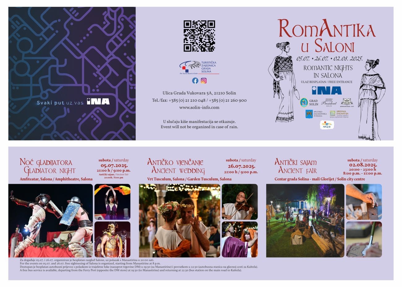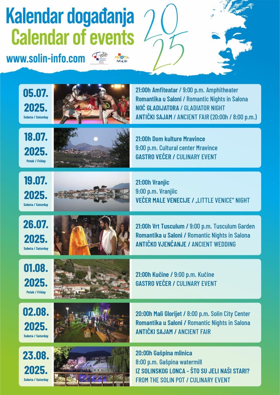 Turistička zajednica grada Solina i ove godine organizira manifestaciju Romantika u Saloni, koja će kroz tri tematske večeri ponuditi autentično i živopisno putovanje u doba antičke Salone. Riječ je o nagrađivanom projektu, dobitniku priznanja „Simply the best 2013“ za inovativnost u turizmu, koji posjetiteljima omogućuje nezaboravan doživljaj povijesti.