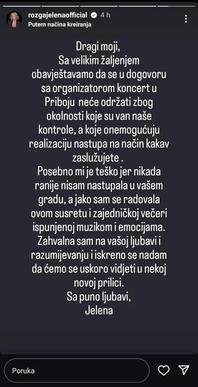 “Dragi moji, s velikim žaljenjem obavještavamo da se, u dogovoru s organizatorom, koncert u Priboju neće održati zbog okolnosti koje su van naše kontrole, a koje onemogućuju realizaciju nastupa na način kakav zaslužujete”, napisala je Jelena u Instagram Storyju.