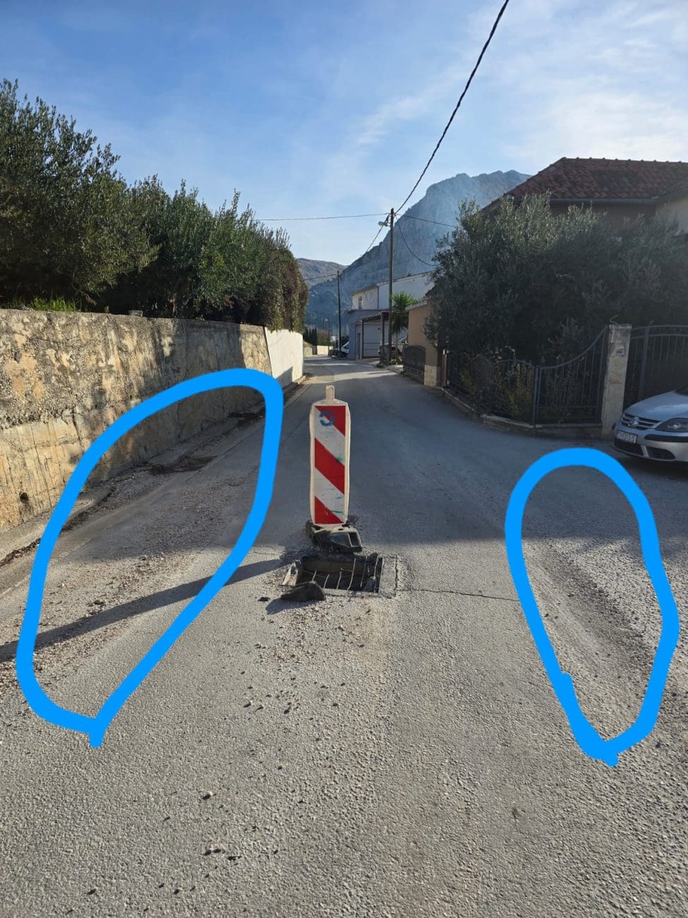 Čitatelj iz Žrnovnice, iz Mosorske ulice u naselju Korešnica, javio nam se upozoravajući na ozbiljan komunalni problem koji već više od 15 dana stoji neriješen. Prema njegovim riječima, na sredini prometnice nalazi se velika rupa nastala propadanjem poklopca šahta. Nadležne službe, tvrdi, izašle su na teren i postavile znak upozorenja, no sanacija do danas nije izvedena.