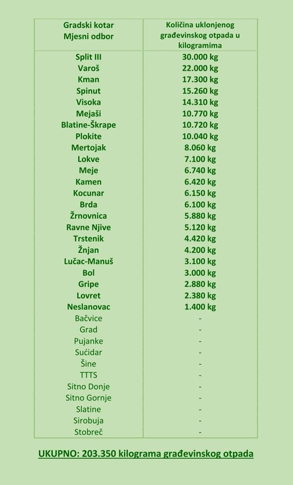 U nastavku pogledajte tablicu u kojoj je vidljivo koliko je građevinskog otpada očišćeni iz pojedinih dijelova Splita zadnja 3 mjeseca.