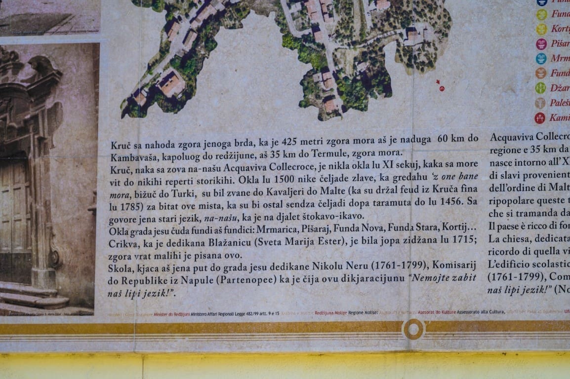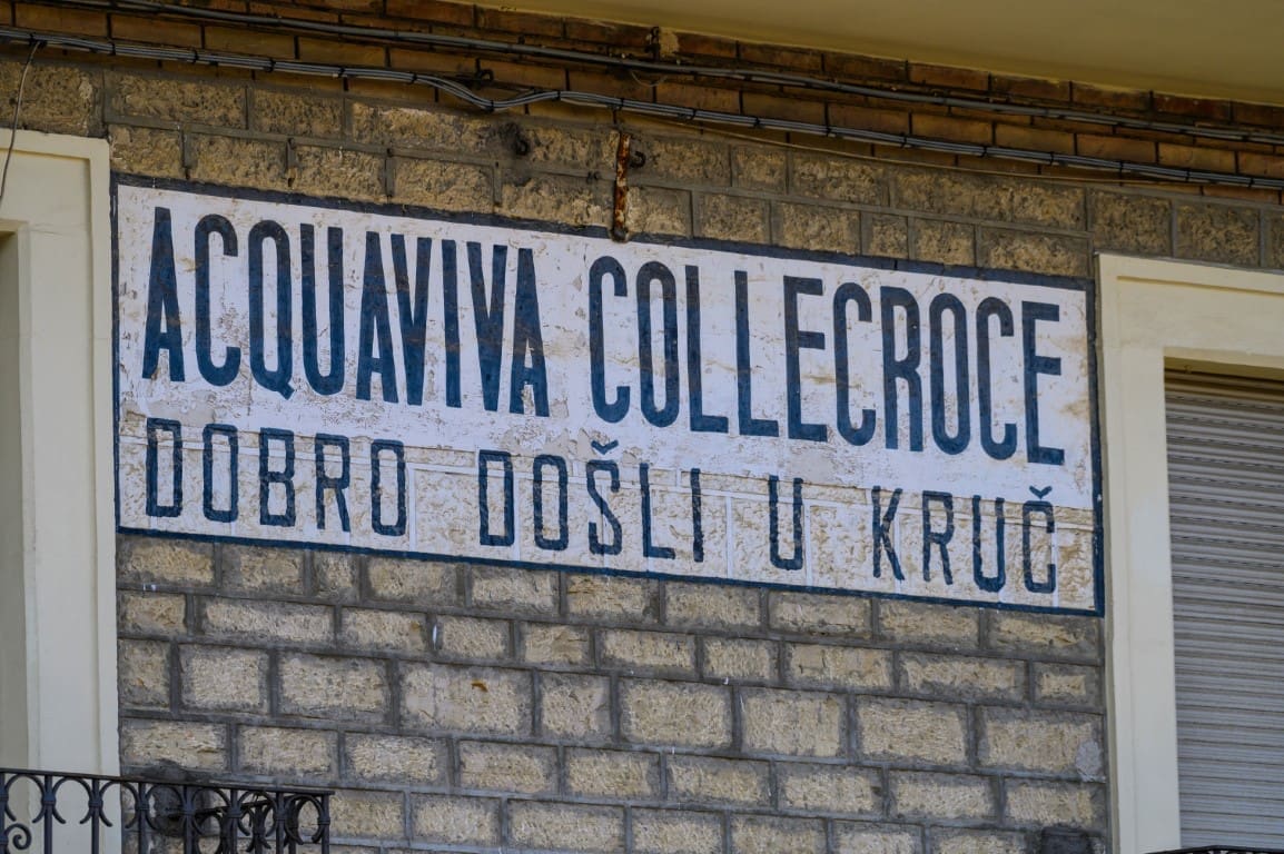 Nakon kave i kroasana, klasičnog talijanskog doručka, krećemo u obilazak sela u kojima žive moliški Hrvati. Lorenzo me sjeda u svoj automobil, a prvo odredište nam je Kruč, odnosno Aquaviva Collecroce. Kruč (Križ) je danas najveće naselje u kojem žive moliški Hrvati. Ima nešto više infrastrukture od Mundimitra, nažalost posljednjih deset godina i tamo je zatvorena posljednja škola. Osim činjenice da je povijest ovog mjesta neraskidivo vezana uz Dalmatince koji su tu doselili u 16. stoljeću, simbol Kruča je templarska zvijezda. Naime, u svojim pohodima s Malte prolazili su ovim područjem gdje su izradili objekte u kojim su se vojnici odmarali na svome dugačkom putu.