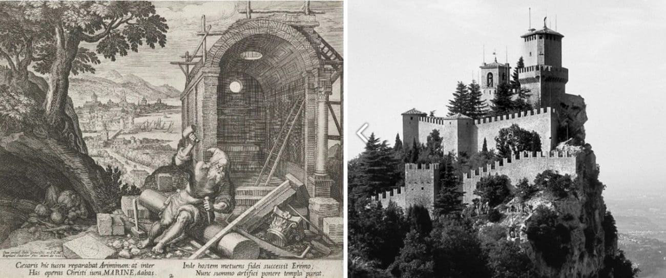 Ilustracija s početka 17. st. koja prikazuje klesara Marina s otoka Raba – legendarnog osnivača San Marina, dok se u pozadini nazire zapadnojadranski grad Rimini (djelo Raphaëla Sadelera (1560.-1632.)); Dvorac na brdu Titan, mjestu utemeljenja San Marina