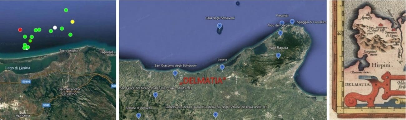 Označeni epicentri niza potresa koji su nedavno pogodili istočno područje „male Dalmacije“ u Italiji – neposredno uz epicentre je garganska laguna Lesina, koja svoje ime dijeli s talijanskim nazivom za hrvatski Hvar; Suvremena mapa zapadnojadranske „male Dalmacije“ s označenim mjestima koja podsjećaju na sadašnje i nekadašnje toponime hrvatskog, slavenskog i dalmatinskog podrijetla – flamanski geograf Abraham Ortelius na svojoj povijesnoj karti „Italia nam tellus Graecia Maior erat…“ nastaloj 1595. godine uz Lesinu postavlja naziv „DELMATIA“ tj. DALMACIJA