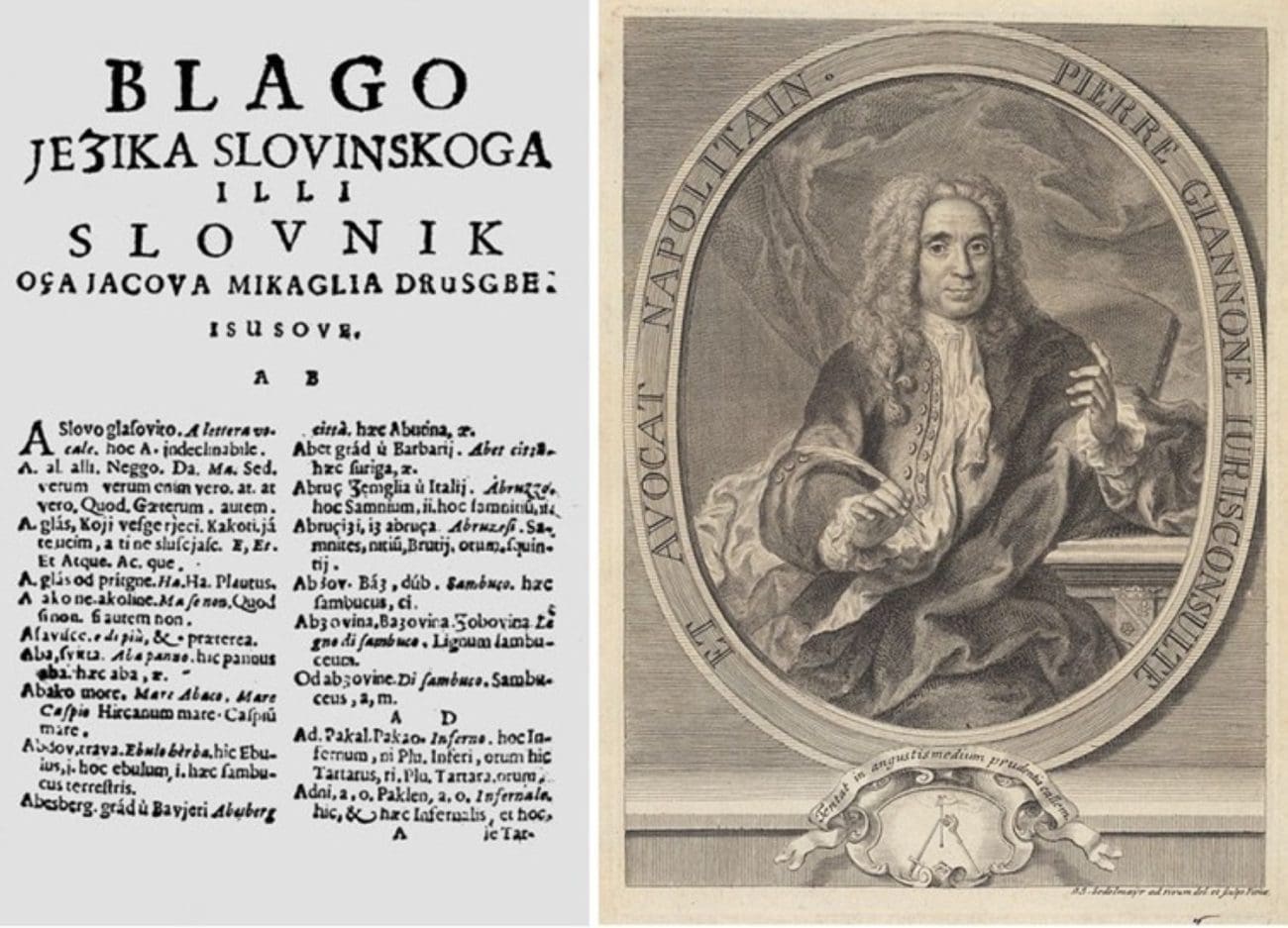 „Blago jezika slovinskoga ili Slovnik u komu izgovaraju se rječi slovinske latinski i dijački“ (Loreto-Ancona, 1649.–1651.), djelo garganskog Hrvata Jakova Mikalje koje se koristilo u vjerskim školama i bilo jezičnim pomagalom isusovačkim misionarima; Mikaljin pranećak, tj. sin Mikaljine nećakinje Lukrecije Mikalja bio je Pietro Giannone (1676. – 1748.), talijanski filozof, povjesničar i pravnik