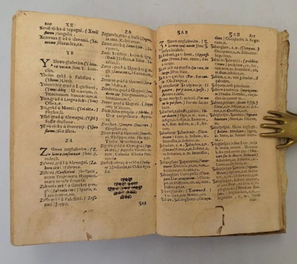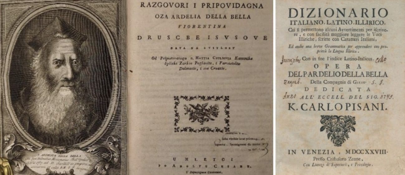 Portret znamenitog isusovca Ardelija Della Belle (1655.-1737.), rođenog u Apuliji, ali koji je veći dio života proveo u Dalmaciji – u zbirci njegovih propovijedi „Razgovori i pripovidanja“; Naslovnica Della Bellinog talijansko-latinsko-hrvatskog rječnika tiskanog 1728. godine