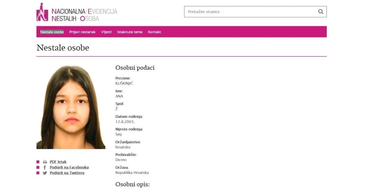 Maloljetnica iz Dicma ponovno je nestala! Potvrđeno nam je to iz splitske policije, a danas je objavljena njena fotografija te opći podaci na službenom popisu nestalih osoba u RH.