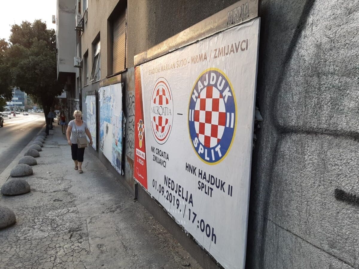 Prošle nedjelje, nogometni klub Croatia Zmijavci u Imotskom je ugostio Hajduk II, a utakmicu su najavili s nekoliko jumbo i led reklama po Splitu i Zagvozdu. Ono što je nama zapelo za oko je da je jedan od tih plakata osvanuo na ilegalnoj lokaciji u Vukovarskoj ulici u Splitu.