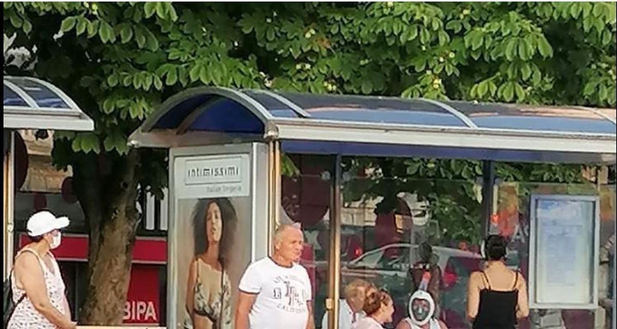 Naime, na autobusnoj stanici na splitskom "Pazaru" nekoliko osoba čeka autobus, no jedna od njih na glavi ima neobičnu masku.