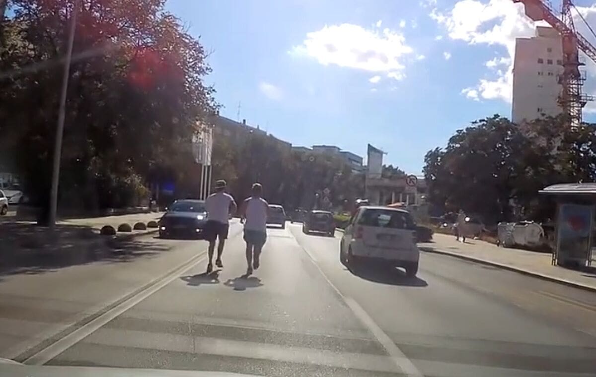 Na društvenim mrežama proširio se video na kojem se vide dva muškarca koji trče posred ceste. Automobili su morali krajnje usporiti da ne riskiraju njihovu sigurnost.