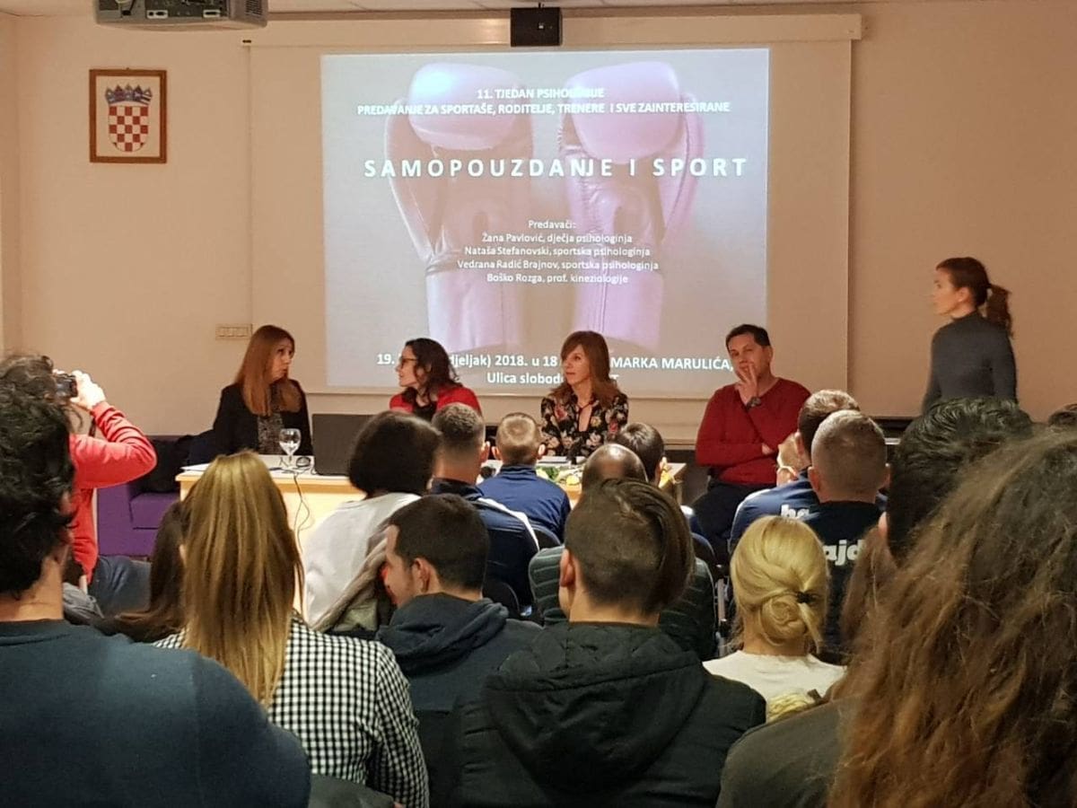 U okviru manifestacije 11. Tjedan psihologije održano je predavanje „Samopouzdanje i sport“ u punoj dvorani Gradske knjižnice Marko Marulić u Splitu. Predavanje su održali dječja psihologinja Žana Pavlović, sportske psihologinje Nataša Stefanovski i Vedrana Radić Brajnov te profesor kineziologije Boško Rozga. Dvorana je bila pretijesna za sve koji su željeli čuti predavanja.