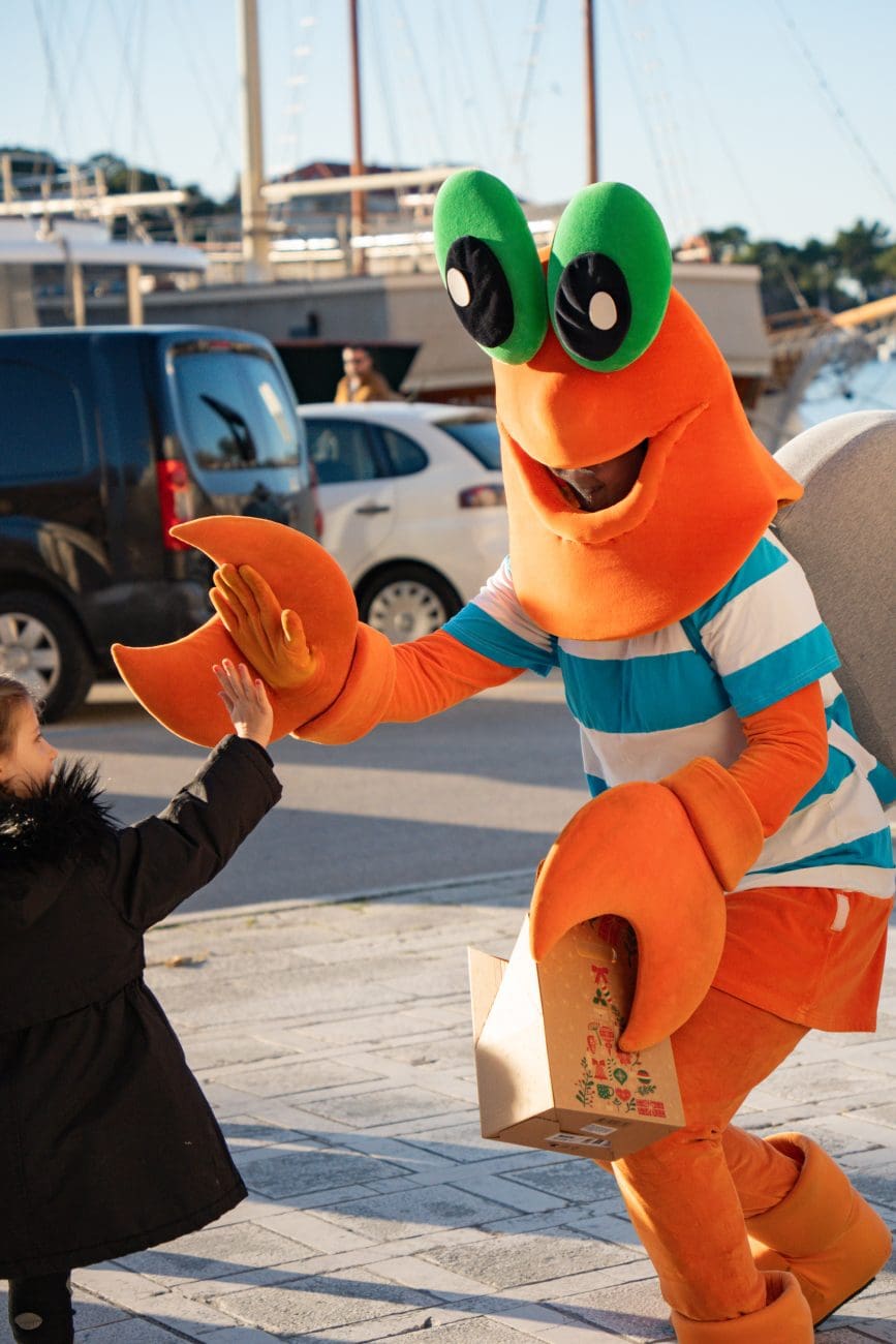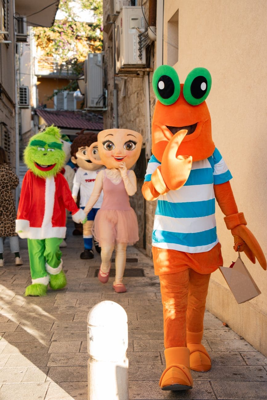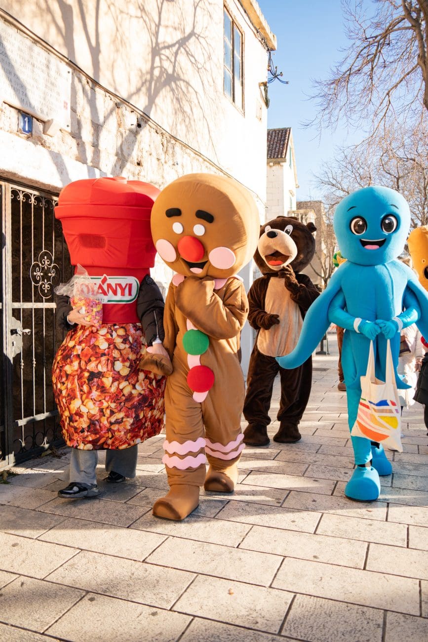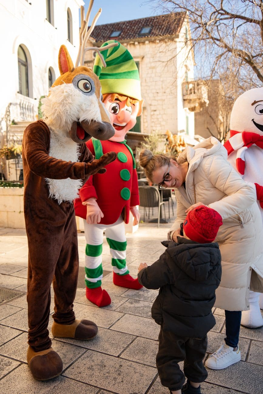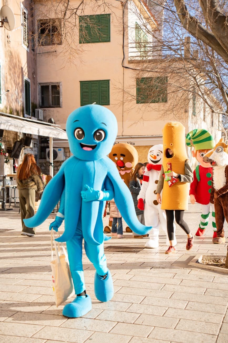 U šarenoj povorci i zajedničkom programu sudjelovalo je čak 16 maskota, prijatelja i partnera sponzora, koje su kroz mali defile gradom i nastup na pozornici stvorile pravu blagdansku bajku. Djeca su imala priliku družiti se sa Sobom, Apfelkom, Vilenjakom Perom, Linom, Grinčem, Ledo Medom, Ballerinom Cappuccinom, Mirami hobotnicom, Snjegovićem, Marom rakom, Kotanyi Mlincem, Medenjakom, Poli Dogom, Galelbom, Medom i glavnom zvijezdom dječakom Ricom. Maskote su neumorno plesale, pozirale za fotografije i širile veselje, pretvarajući Kačićev trg u mjesto iskrene dječje sreće i toplog obiteljskog zajedništva.