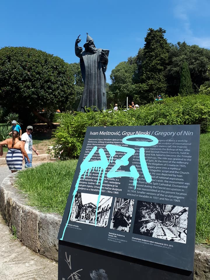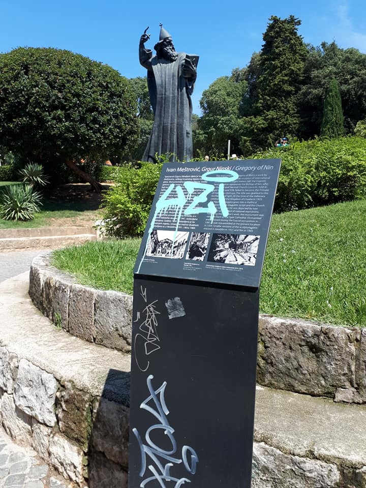 Info ploča koja domaćim i stranim gostima tumači tko je bio Grgur Ninski i koji je njegov značaj u nacionalnoj povijesti devastirana je sprejom prije nekoliko tjedana, a do danas je nitko nije očistio.