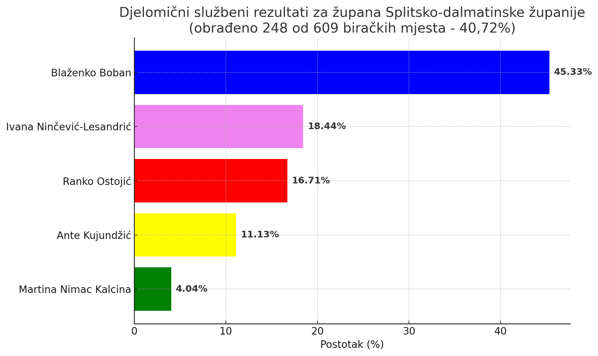 Prema nepotpunim službenim rezultatima za izbor župana Splitsko-dalmatinske županije, nakon obrađenih 248 od ukupno 609 biračkih mjesta (40,72 %), u vodstvu je aktualni župan Blaženko Boban (HDZ, DP, HSP AS) s osvojenih 45,33 % glasova, odnosno 21.103 glasa.