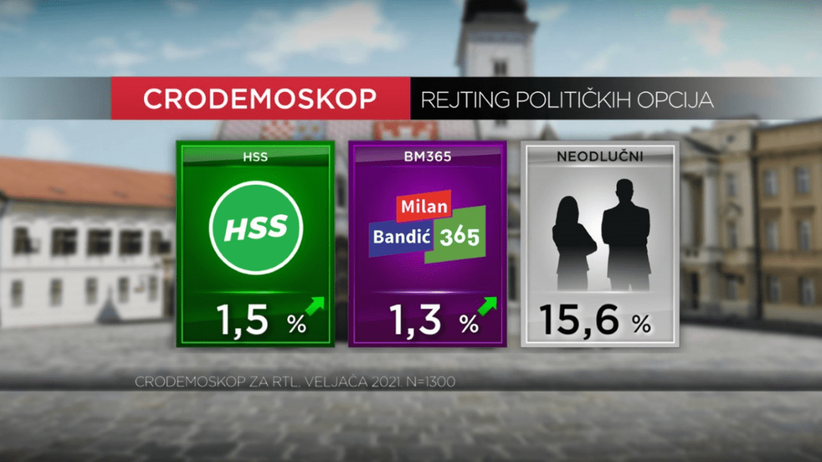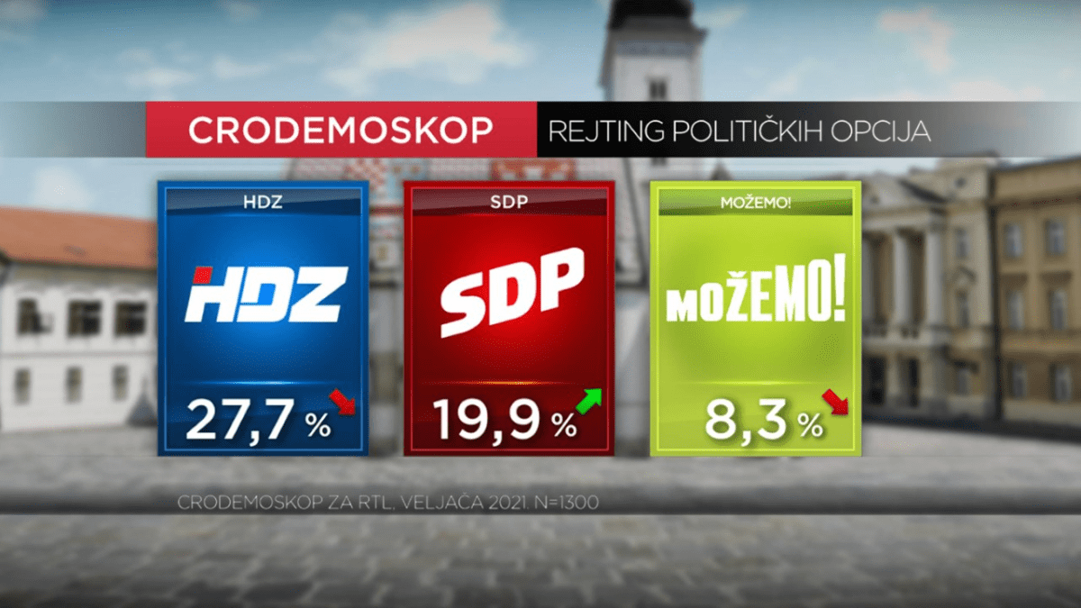 U stopu ih prati Most (7,3 posto), a uz rast rejtinga približio se i Domovinski pokret (7,2 posto). Centar stoji nešto lošije stoji nego u siječnju – 2,1 posto, a slijedi IDS (1,6 posto).