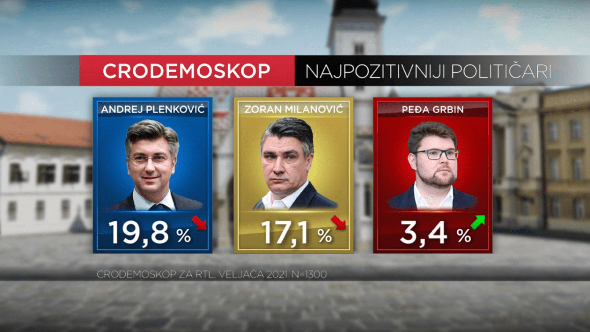 Nešto manje odlučno nego u siječnju, ali premijera Andreja Plenkovića (19,8 posto) ponovno najviše ispitanika bira kao najpozitivnijeg političara. Također s nešto lošijim rejtingom, ali drugi izbor ostao je predsjednik Republike Zoran Milanović (17,1 posto). Predsjedniku SDP-a Peđi Grbinu (3,4 posto) rejting raste pa je u veljači treći izbor, ali i dalje je daleko od vodećeg dvojca.