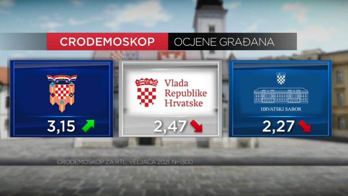 Evo i ocjena Ureda Predsjednika, Vlade i Sabora. Čvrsta trojka za Pantovčak (3,15), Banski dvori (2,47) pali su na dvojku, a također dvojka, ali s lošijim prosjekom ide Hrvatskom saboru (2,27).