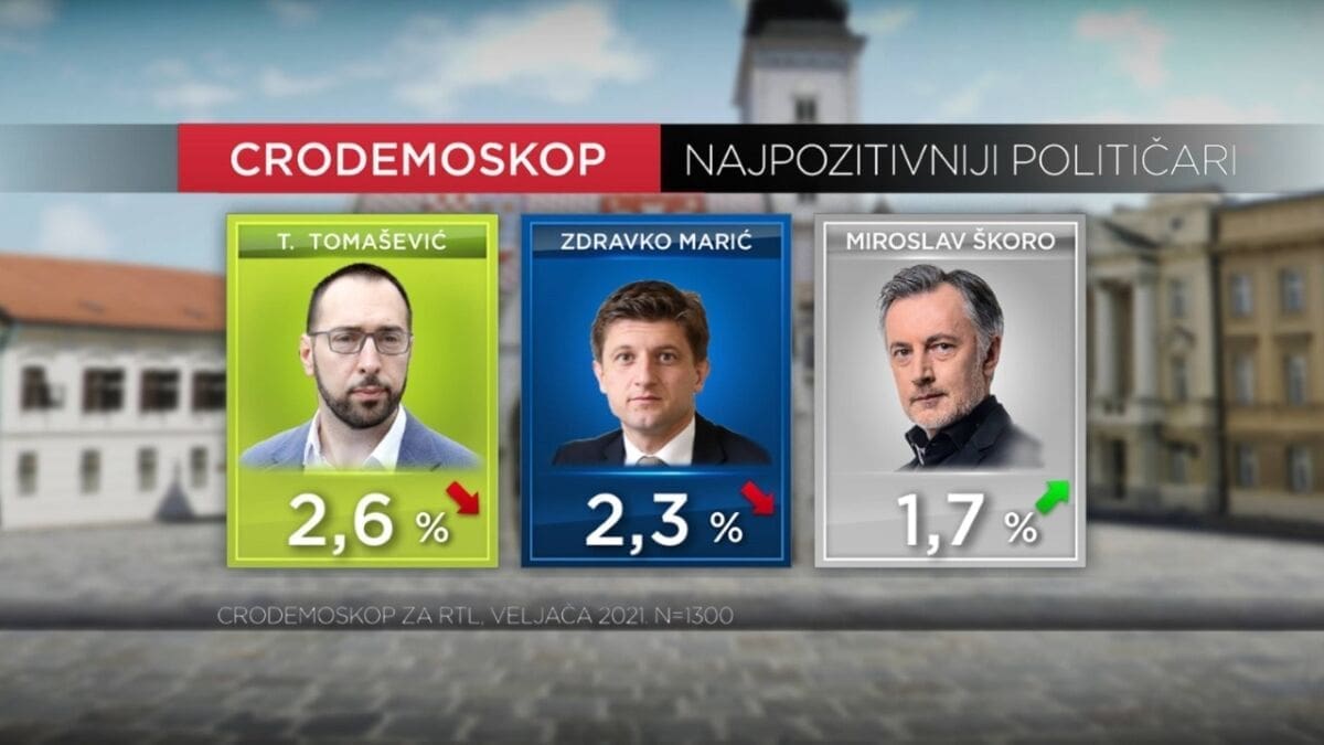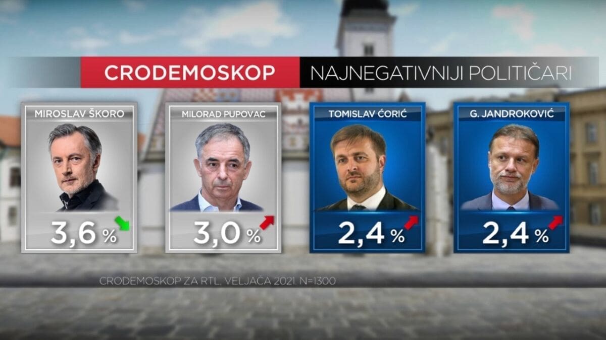 Manje ispitanika Miroslava Škoru (3,6 posto) negativno ocjenjuje, a Milorad Pupovac (3 posto), Tomislav Ćorić (2,4 posto) i Gordan Jandroković (2,4 posto) povećali su negativan doživljaj među ispitanicima: najviše upravo ministar gospodarstva. Ministra Ćorića u siječnju je tek 0,1 posto ispitanika negativno ocijenilo.