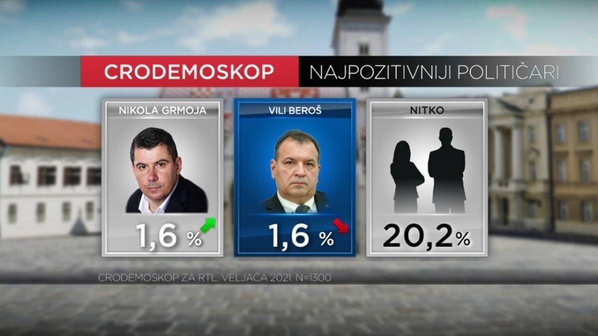 Ispod 2 posto su i Nikola Grmoja (1,6 posto) i Vili Beroš (1,6 posto), a najviše ispitanika, više od petine smatra da je najpopularniji političar – Nitko (20,2 posto)!