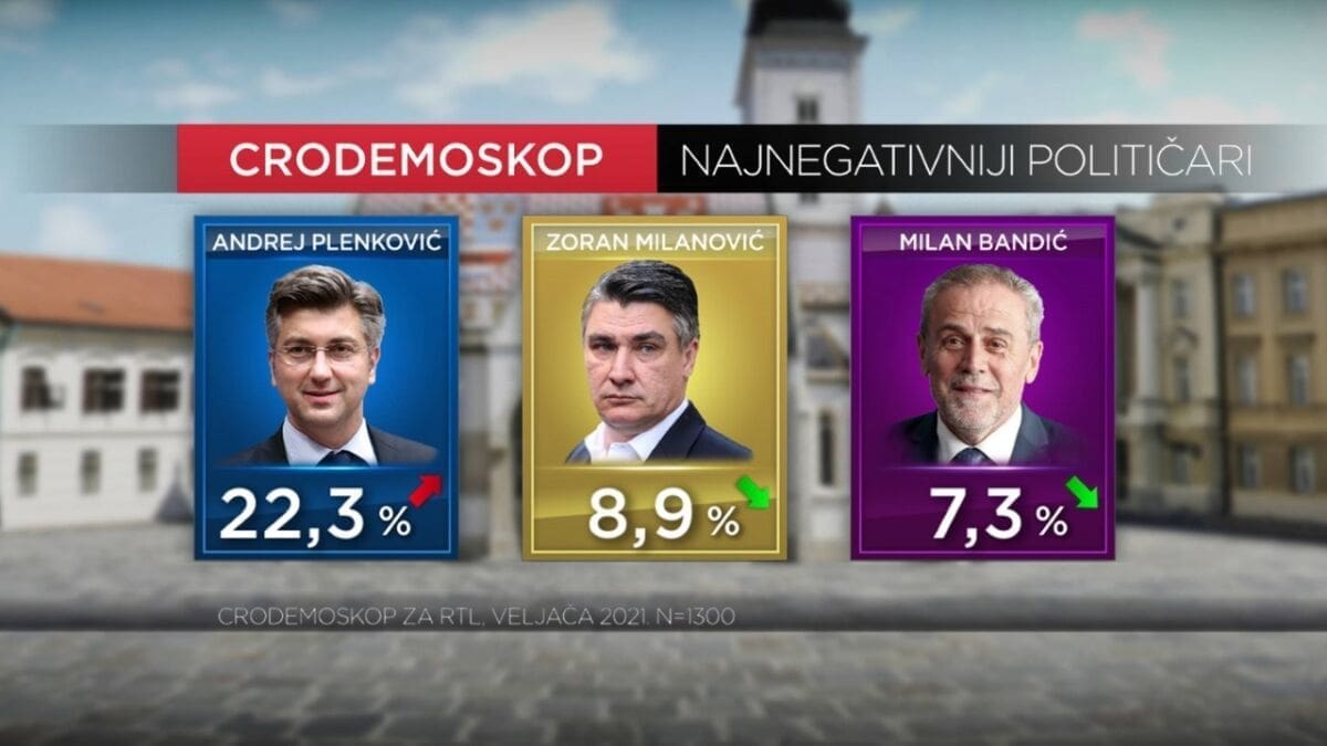 Vrh ljestvice najnegativnijih političara zauzeo je isti dvojac. Najviše ispitanika, 3 postotna boda više nego u siječnju, bira premijera Andreja Plenkovića (22,3 posto) kao najnegativnijeg političara u zemlji. Negativni doživljaj smanjio je predsjednik Republike Zoran Milanović pa njega u takvom svjetlu vidi 8,9 posto ispitanika. Treći izbor je zagrebački gradonačelnik Milan Bandić (7,3 posto) koji to želi biti i iduće 4 godine.