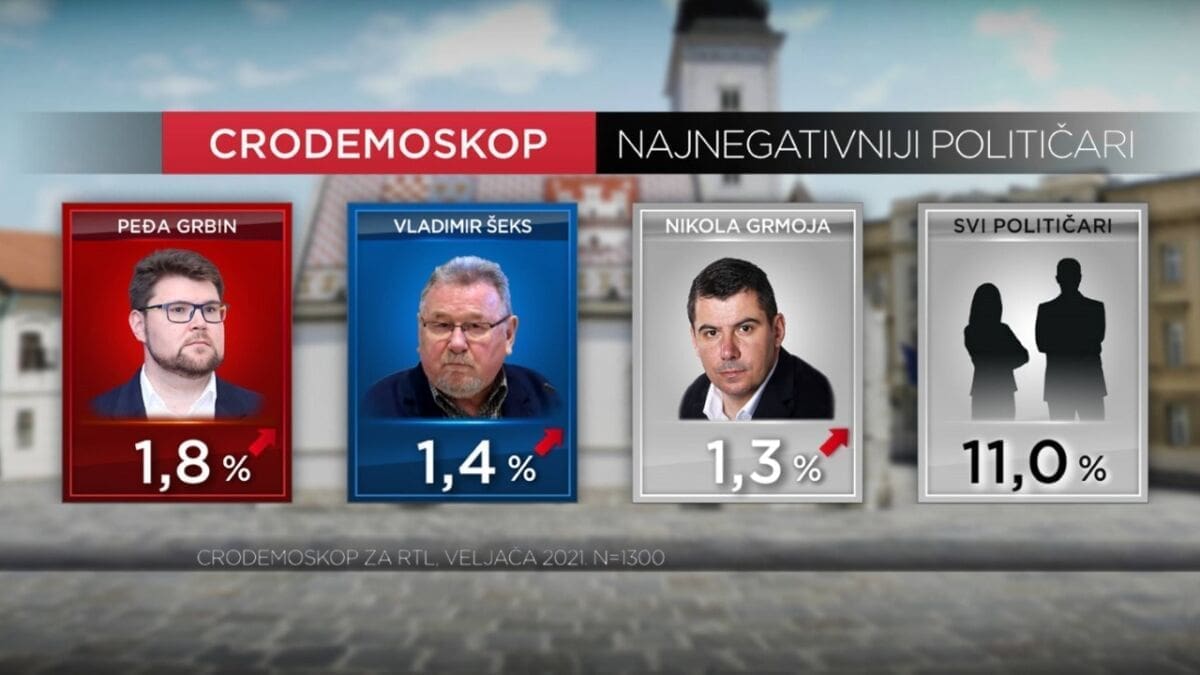 Lošiji je rejting i Peđe Grbina (1,8 posto) i Vladimira Šeksa (1,4 posto) i Nikole Grmoje (1,3 posto). Da su negativni svi političari stav je 11 posto ispitanika.