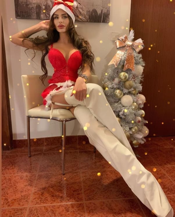 Na prvoj objavi danas promovirala je zaštitnu masku, a na drugoj je zavodljivo pozirala na stolici. Na glavi je imala kapu Djeda Božićnjaka, a crveni korzet naglasio je njen tanki struk i grudi.