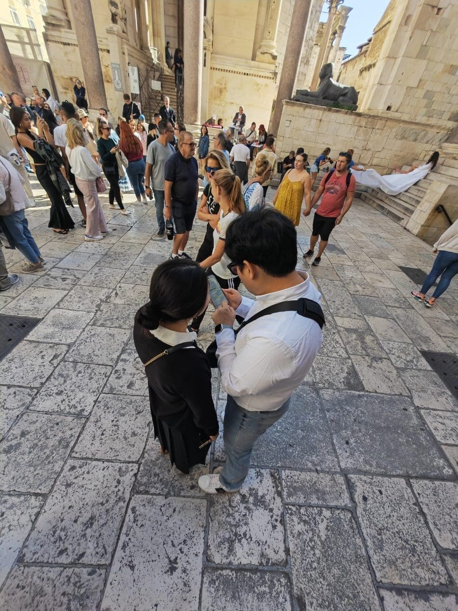 Najviše je trenutno gostiju s kruzera, Amerikanaca koji su se na Peristilu našli zajedno s ostalim gostima, bilo domaćim bilo stranim, za vrijeme fotografiranja modnog editorijala ili pak mladenke.