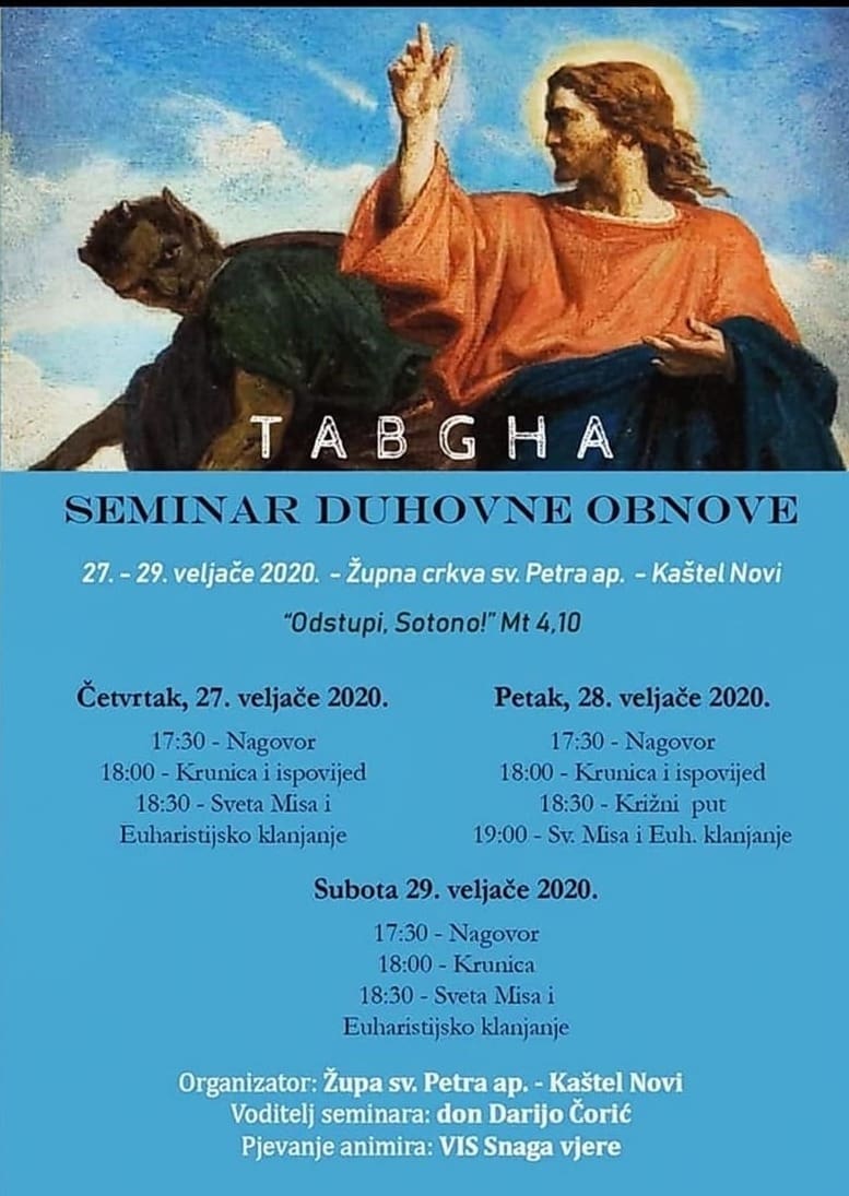 Župa sv. Petra apostola iz Kaštel Novog organizira od 27. do 29. veljače četvrti seminar duhovne obnove pod nazivom Tabgha. Tema ovog seminara jest "Odstupi sotono".