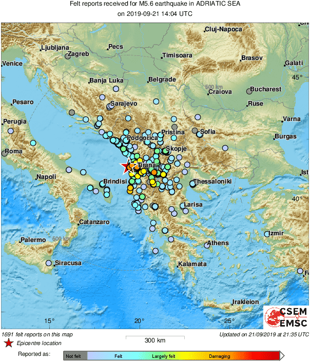 Dva najjača potresa osjetila su se u Hrvatskoj, Crnoj Gori, Srbiji, Grčkoj, Makedoniji i Italiji, a u Albaniji je zabilježena i materijalna šteta. Ministrica zdravstva Ogerta Manastirliu je rekla kako je 68 ljudi liječeno zbog ozljeda u Tirani i Draču. Većina je ozlijeđena dok su panično bježali iz domova.