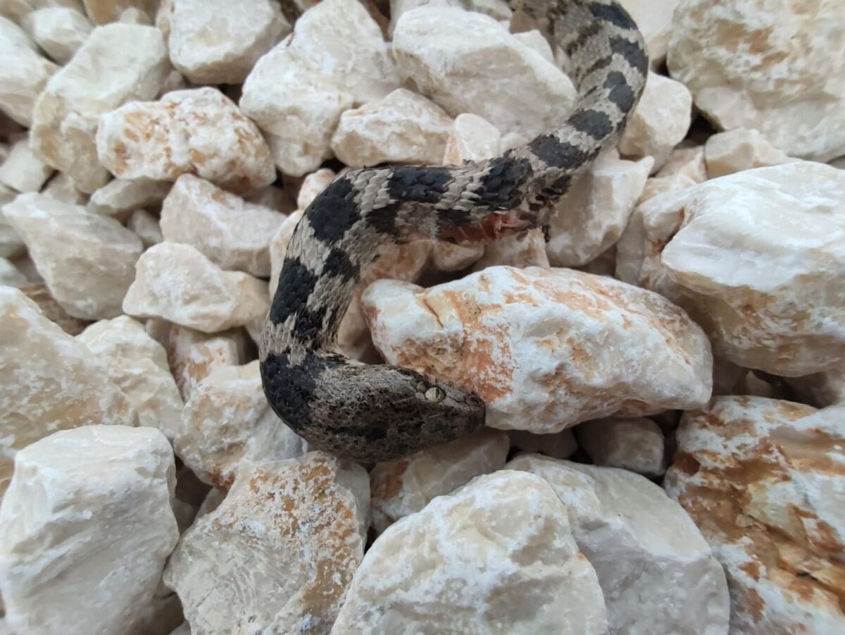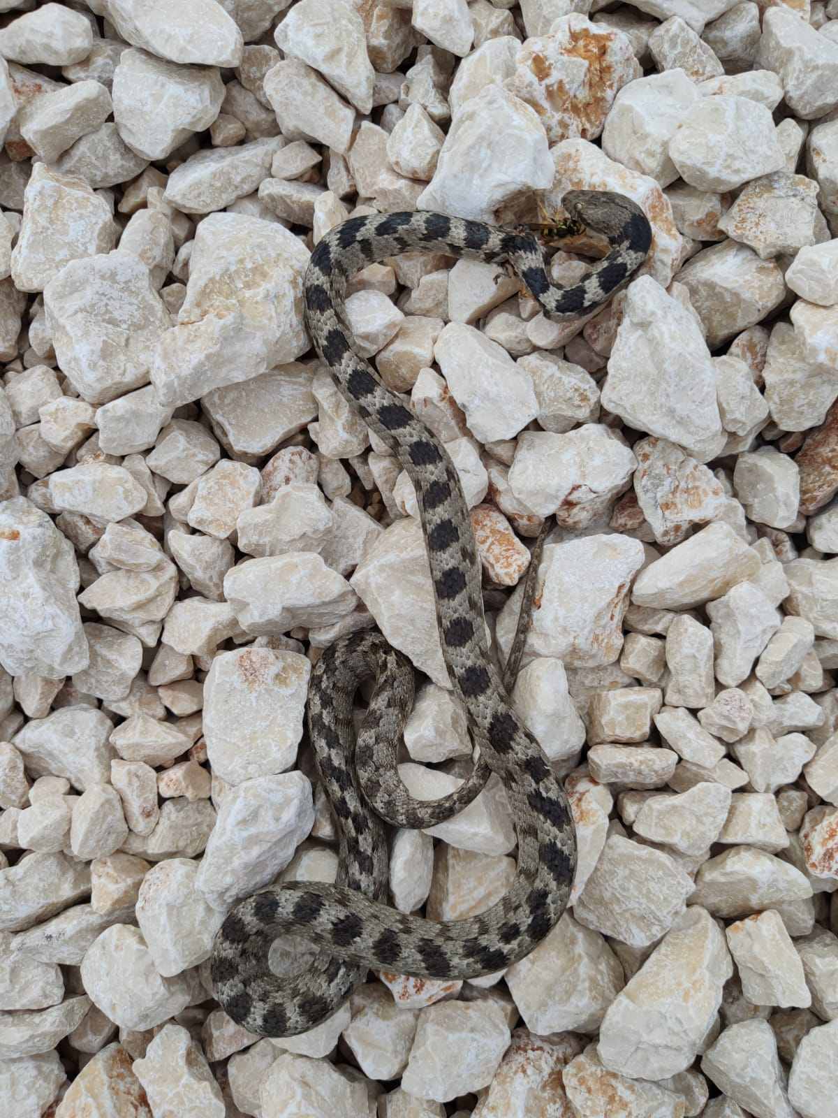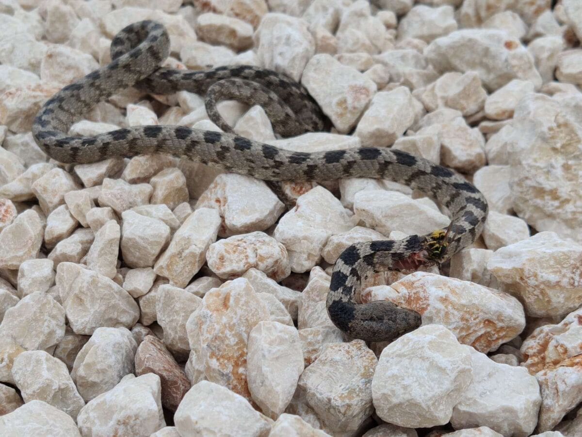 Ovo je prizor koji ni njemu nije baš najuobičajeniji ali i na koji većina ne bi voljela naići. Međutim, zmija je bila mrtva, a radilo se o Ljutoj crnokrpici Telescopus fallaxas koja je bezopasna za ljude.