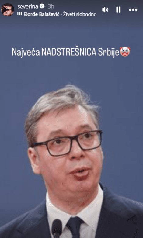 "Najveća NADSTREŠNICA Srbije", napisala je uz fotografiju srpskog predsjednika Aleksandra Vučića i dodala emotikon klauna te Balaševićevu pjesmu Živeti slobodno.