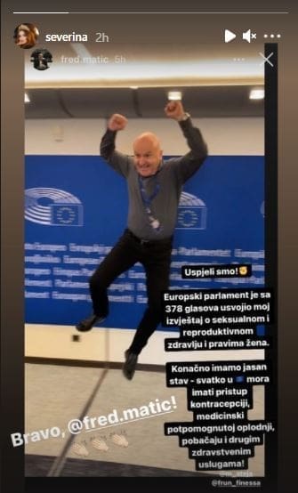 Severina Kojić je na svom Instagram storyju podijelila objavu Freda Matića na kojoj on slavi jer je Europski parlament usvojio njegov izvještaj o pobačaju.