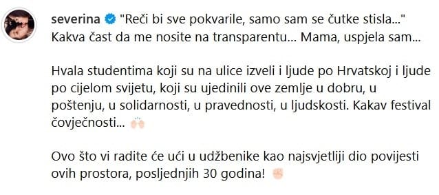 - Reči bi sve pokvarile, samo sam se čutke stisla... Kakva čast da me nosite na transparentu. Mama, uspjela sam. Hvala studentima koji su na ulice izveli i ljude po Hrvatskoj i ljude po cijelom svijetu, koji su ujedinili ove zemlje u dobru, u poštenju, u solidarnosti, u pravednosti, u ljudskosti. Kakav festival čovječnosti. Ovo što vi radite će ući u udžbenike kao najsvjetliji dio povijesti ovih prostora posljednjih 30 godina – napisala je Severina.
