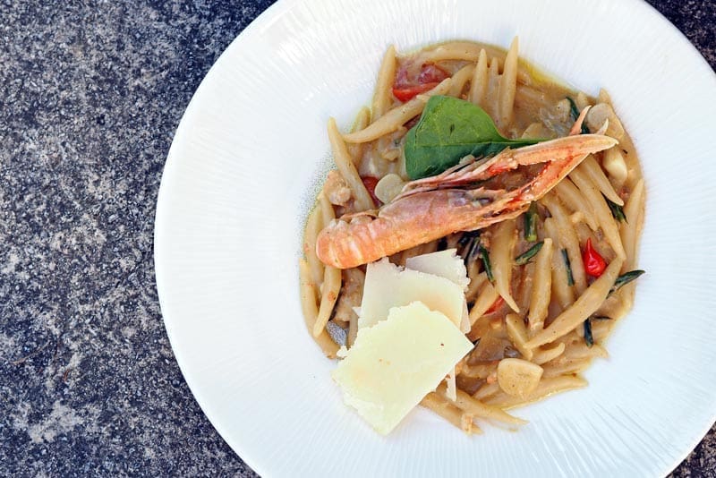Na zagrijanoj tavi pržiti škampe, izdvojiti ih te u tu masnoću dodati mladi luk, češnjak i šparoge te zajedno pržiti 20 sekundi lagano podlijevajući temeljcem. U to dodati pljukance i kuhati desetak minuta. Pri završetku pet minuta prije staviti pržene škampe da pust okus i povežu sve namirnice.