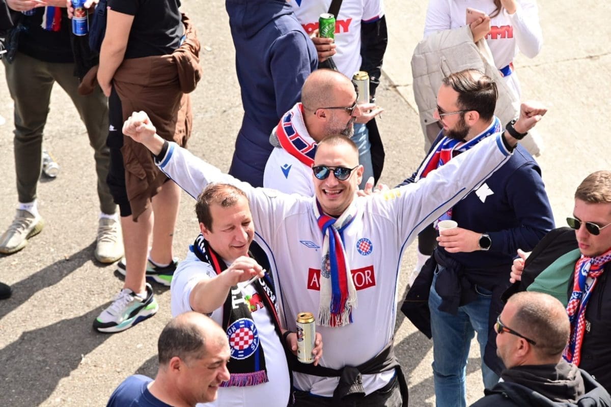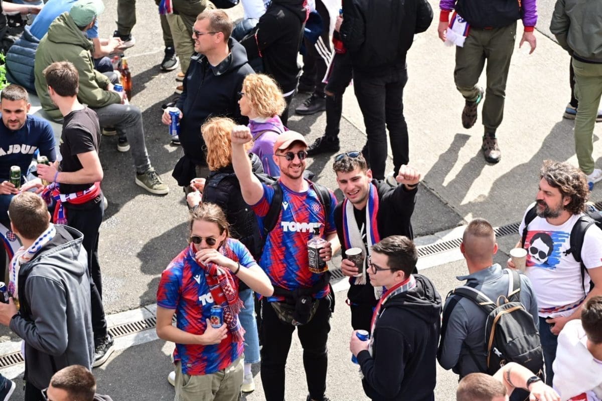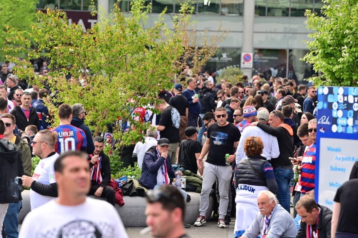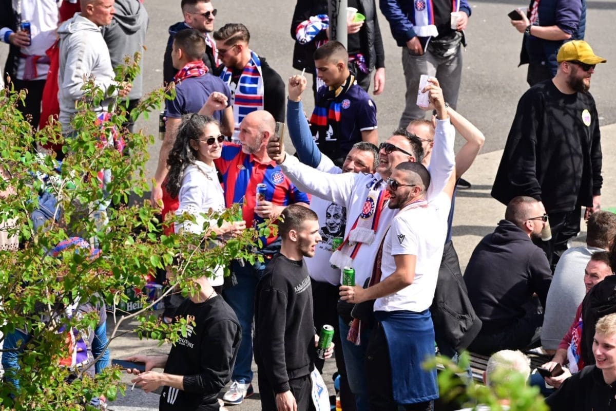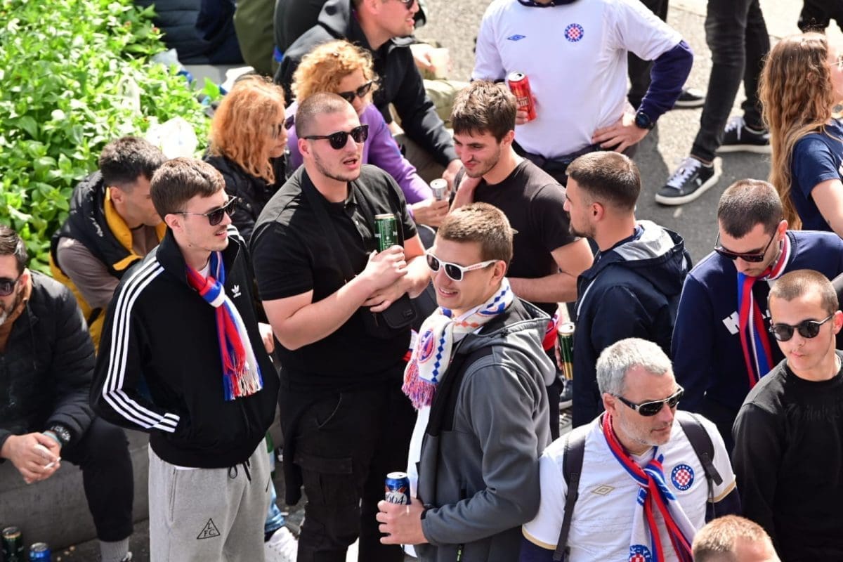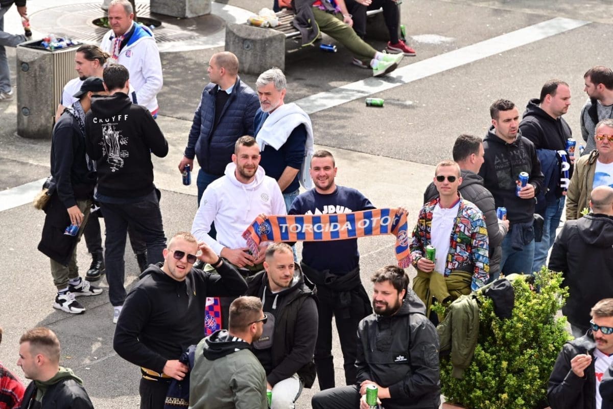 Vesela je atmosfera u Ženevi ispred stadiona. Kao da se igra na Poljudu, sve je puno navijača splitskog Hajduka. Pjevaju se pjesme, pale se baklje...
